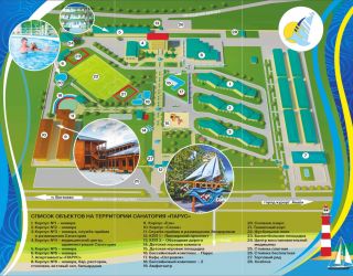 Санаторий занимает обширную, утопающую в зелени, благоустроенную территорию площадью 8 гектаров. Тенистые аллеи для прогулок, фонтаны, беседки, яркая подсветка в темное время суток — все это располагает к комфортному отдыху. На территории также есть парк фигурных растений — Топиари.